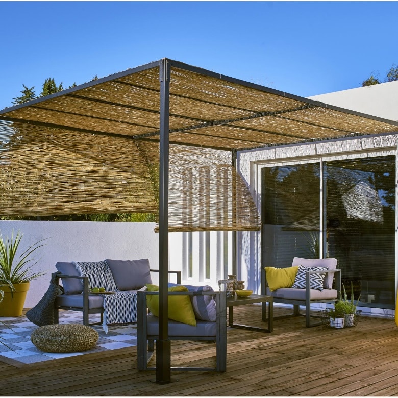 Pas envie de plantes ? Une canisse de fibres végétales posée sur le dessus de la pergola crée une ombre légère et une ambiance balnéaire.